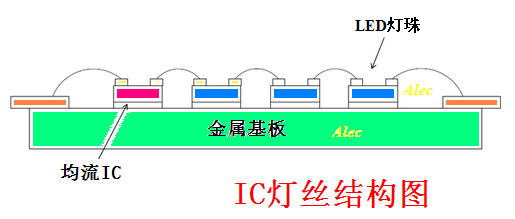 IC 燈絲是直接將恒流IC 芯片綁定在燈絲基板上,恒流IC 在燈絲基板上與N顆LED 燈珠芯片直接串聯成一體,成為有自控燈絲電流的新型電子LED 燈絲。