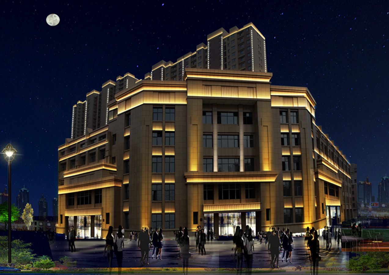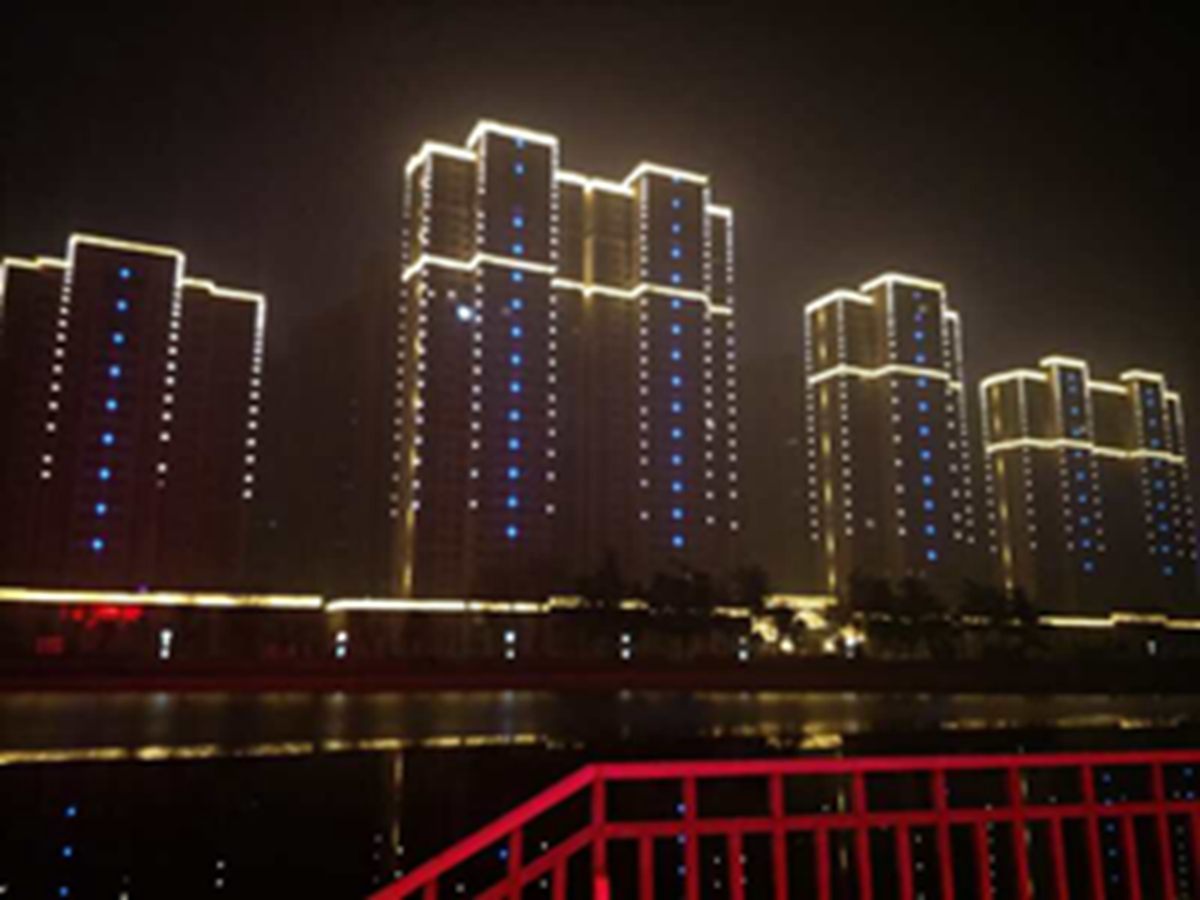 金河灣小區緊挨護城河,整體構思以“黑夜的星空”為主,突出頂部輪廓,體現整體布局,主要以點光源作為點綴,使樓體呈現出閃閃發光的視覺體驗,水中倒映著,更別有一番意境。